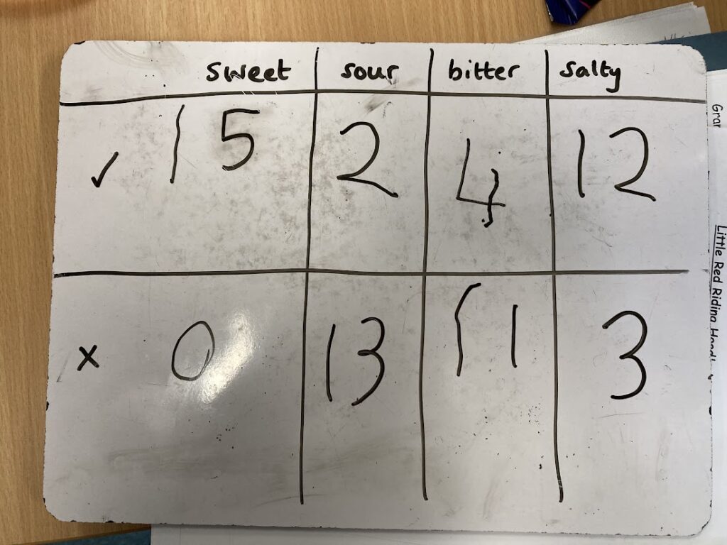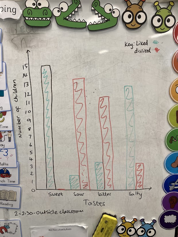 In our TASTE Lesson Theo R was our Scientist. After learning about the mouth and tongue, we learnt that we have different taste buds on our tongue. These taste buds help us detect the different tastes. Everyone in Year 1 had the chance to try our four main foods/liquids: Cocoa-bitter, honey-sweet, Lemon Juice-sour and crisps-salty. They then voted on the tastes they liked and disliked. Theo R collected the results of our testing to see which taste was the most popular and least popular. He then put to results into a bar graph to show the most and least favourite tastes.