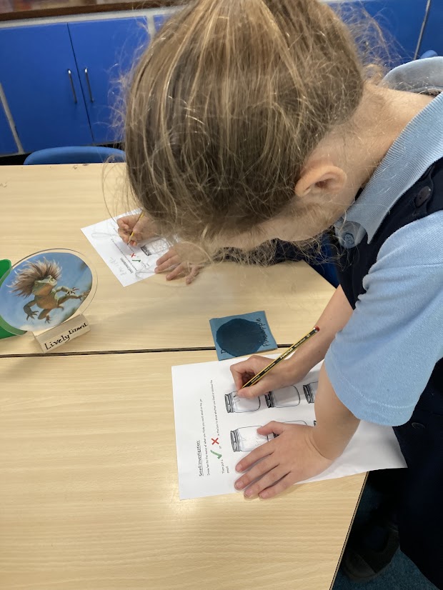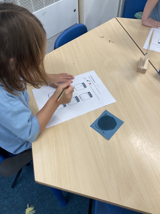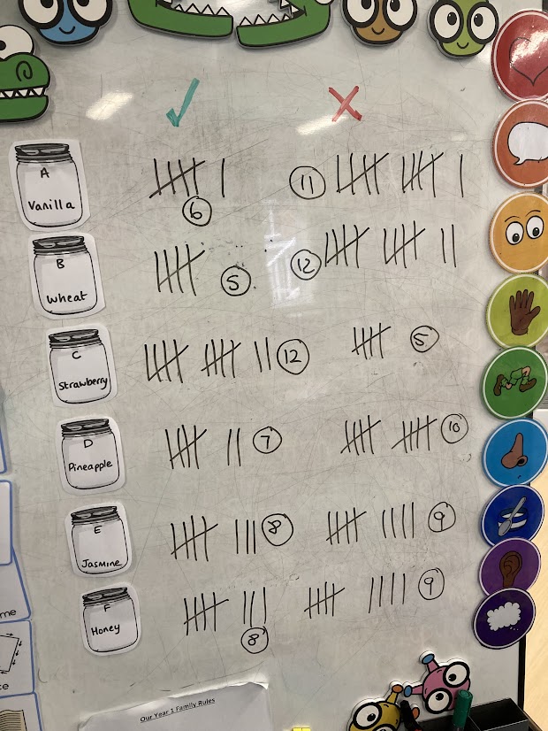 In our SMELL lesson, Joshua was our Scientist. After learning about our nose and how we smell, the children tried different scents. They voted on the smells they liked and disliked and explained why. We used tally marks to record the results. Then Joshua had 3 scent pairs that he had to match up only using his sense of smell. It was a very tricky task!