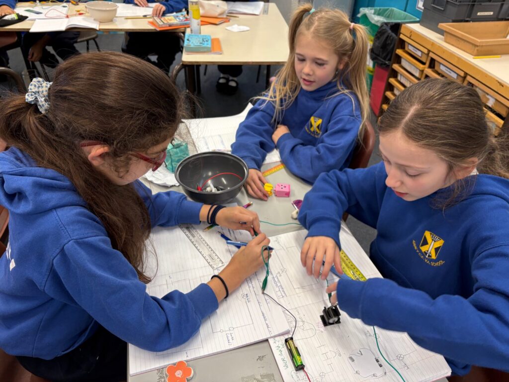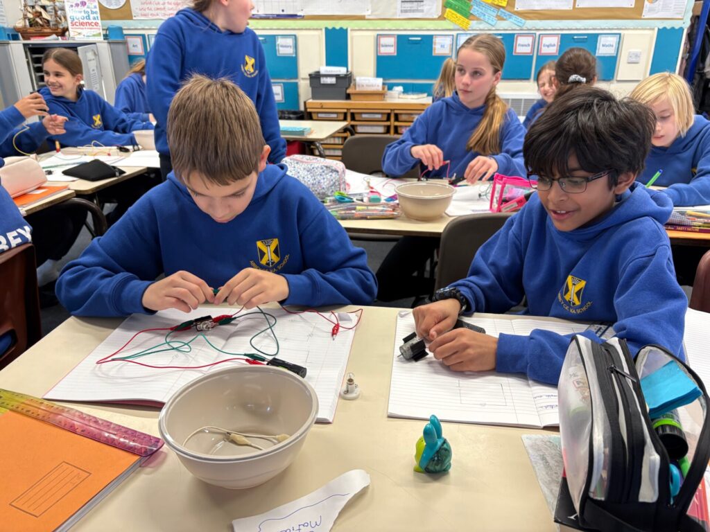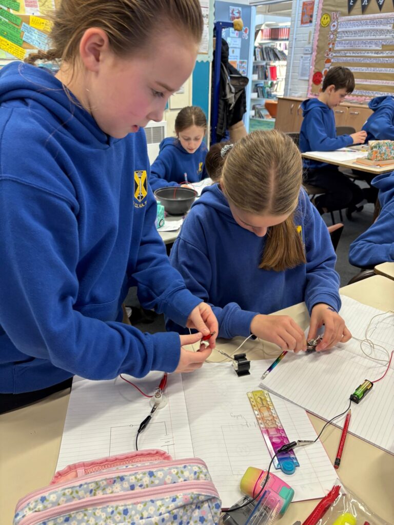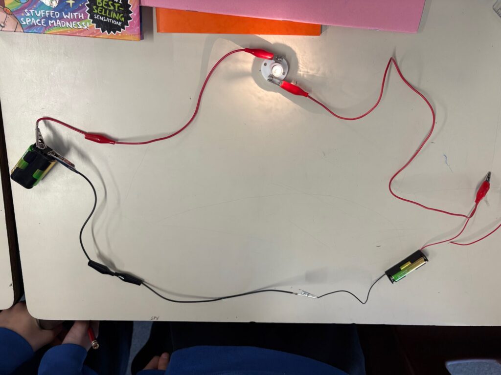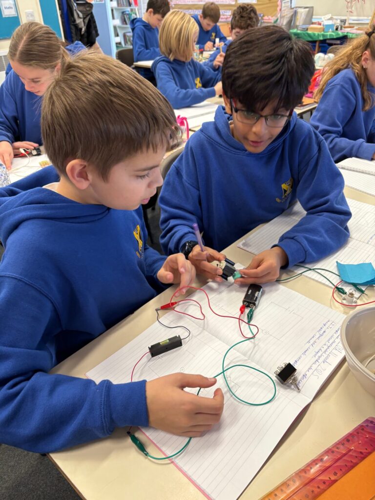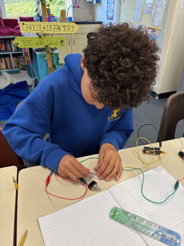 Our science unit this half term is ‘Electrical circuits and components’ and we have been constructing circuits using various components including bulbs, buzzers, motors and switches. We have created different series circuits (a circuit where all the components are connected in one single loop), complete and incomplete circuits and compared and given reasons for variations in how components function, including the brightness of bulbs, the loudness of buzzers and the on/off position of switches. Our investigations have enabled us to spot patterns between the number of components and the brightness of bulbs and loudness of buzzers and identify that when more bulbs or buzzers are added to a circuit, the components dim or get quieter, even if the voltage remains the same. We have discovered that adding more components means that it is more difficult for the current to flow around the circuit, which is why the brightness of bulbs decreases when more are added.